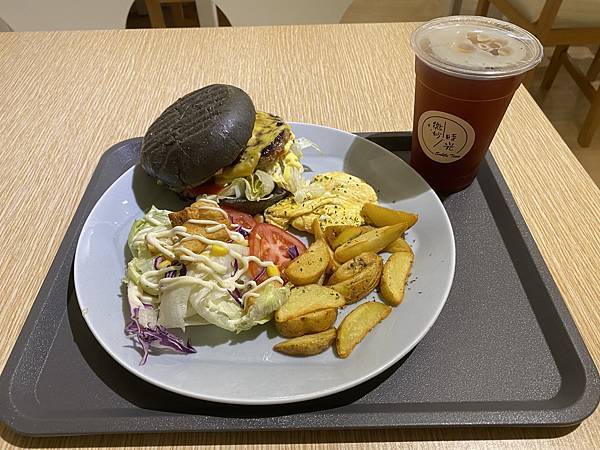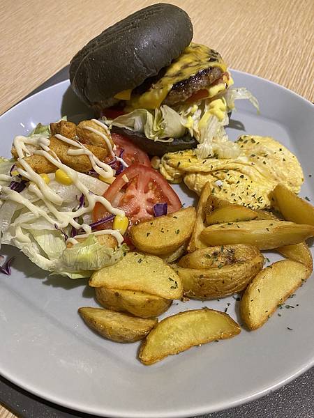 除了主角的漢堡外,還有炒蛋、薯塊、沙拉,沙拉上面還有麵包塊,那麵包塊蠻好吃的。